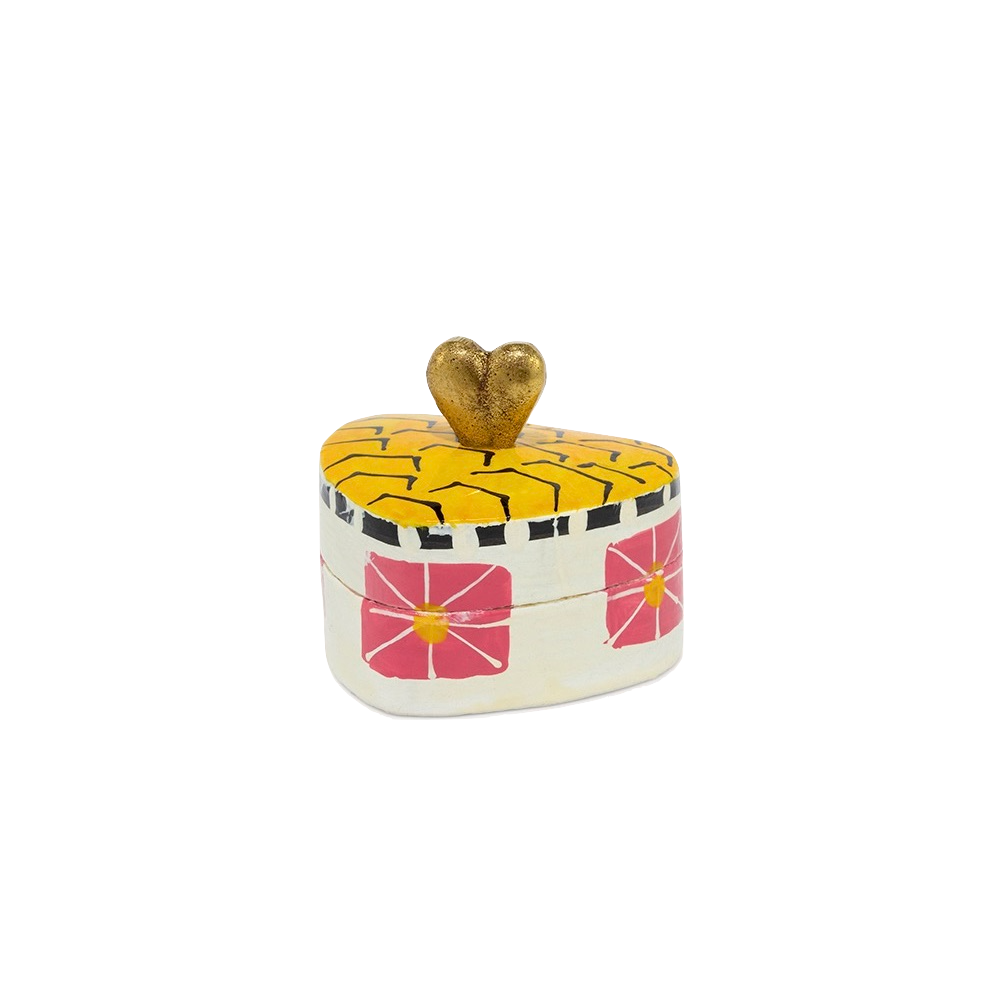 • Handbeschilderd keramiek van Que Rico in wit en geel: vaas, sapkan en kleine bloempot. In de vaas staan vilten bloemen in wit en okergeel.