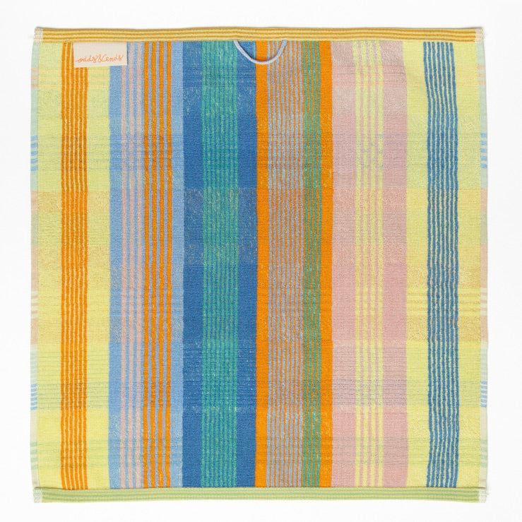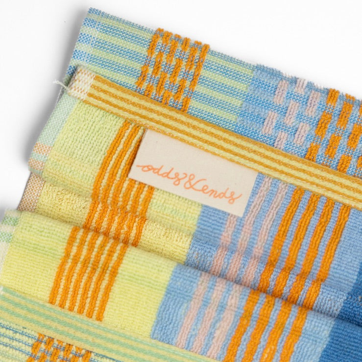Bijzonder is dat ze gemaakt zijn van resten fabrieksgaren. Dat zit zo: fabrieken verven altijd wat extra garen, zodat ze zeker genoeg hebben. Vaak blijven deze echter ongebruikt. Hartstikke zonde natuurlijk van dit mooie materiaal! Het Odds & Ends keukentextiel is zo ontworpen, dat het maximale uit deze restanten wordt gehaald, en tegelijkertijd onverwachte, interessante kleurcombinaties ontstaan.