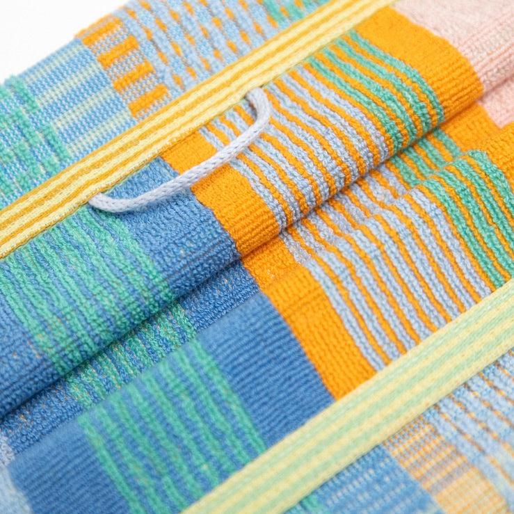 Werken met restmateriaal betekent ook dat de handdoeken onderling iets van elkaar kunnen verschillen. Tijdens de productie raken de restjes op en worden ze vervangen door vergelijkbare kleuren. Dit verkleint kleine variaties binnen een batch.