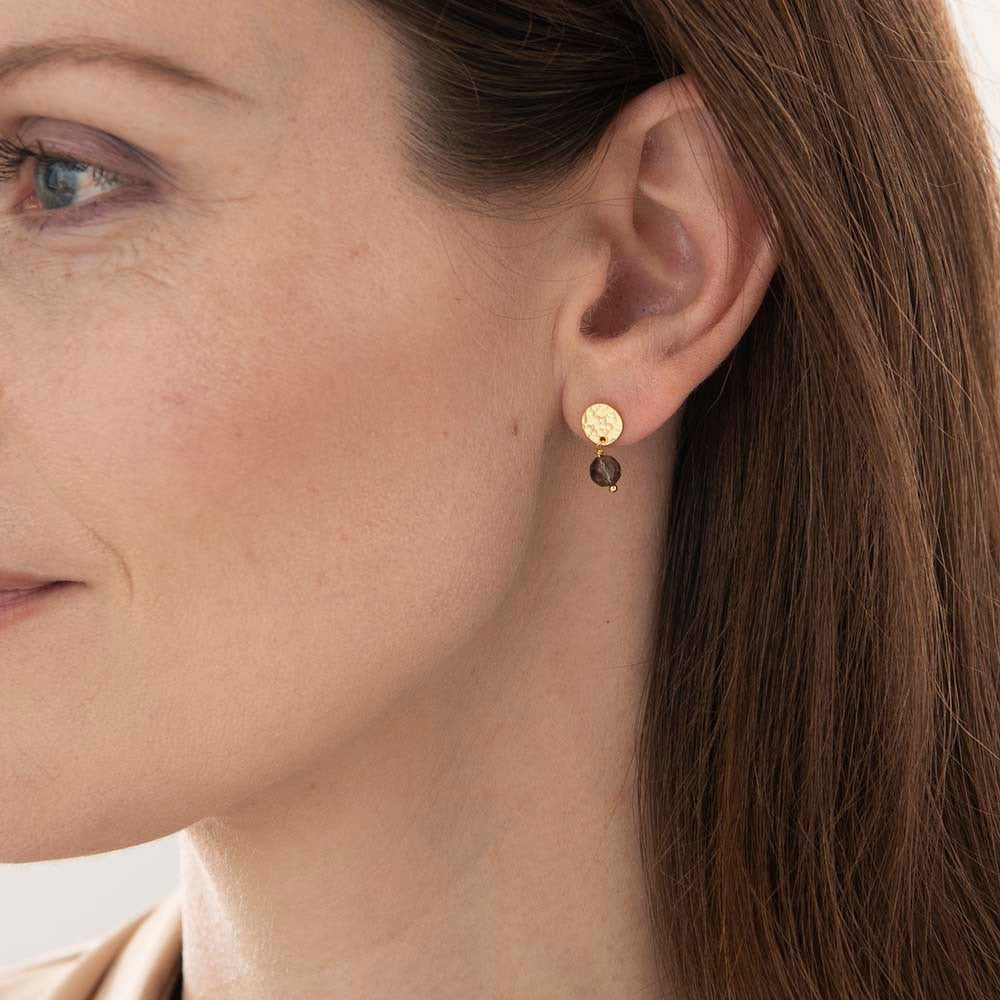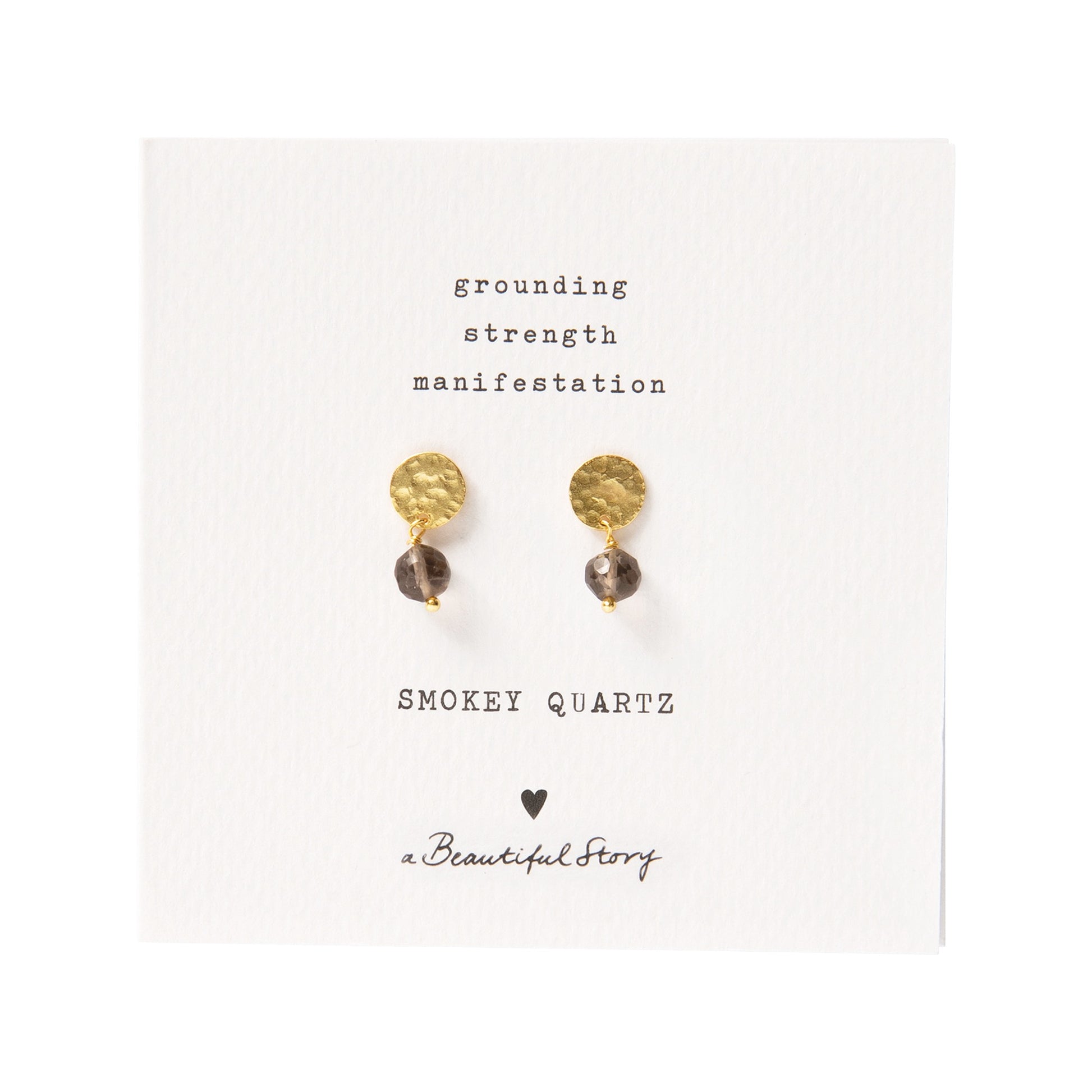 Deze Mini Coin-oorbellen van A Beautiful Story zijn ambachtelijk gemaakt. De kleine oorknopjes bestaan uit een goudkleurig muntje met daaraan een kleine rookkwarts edelsteen.