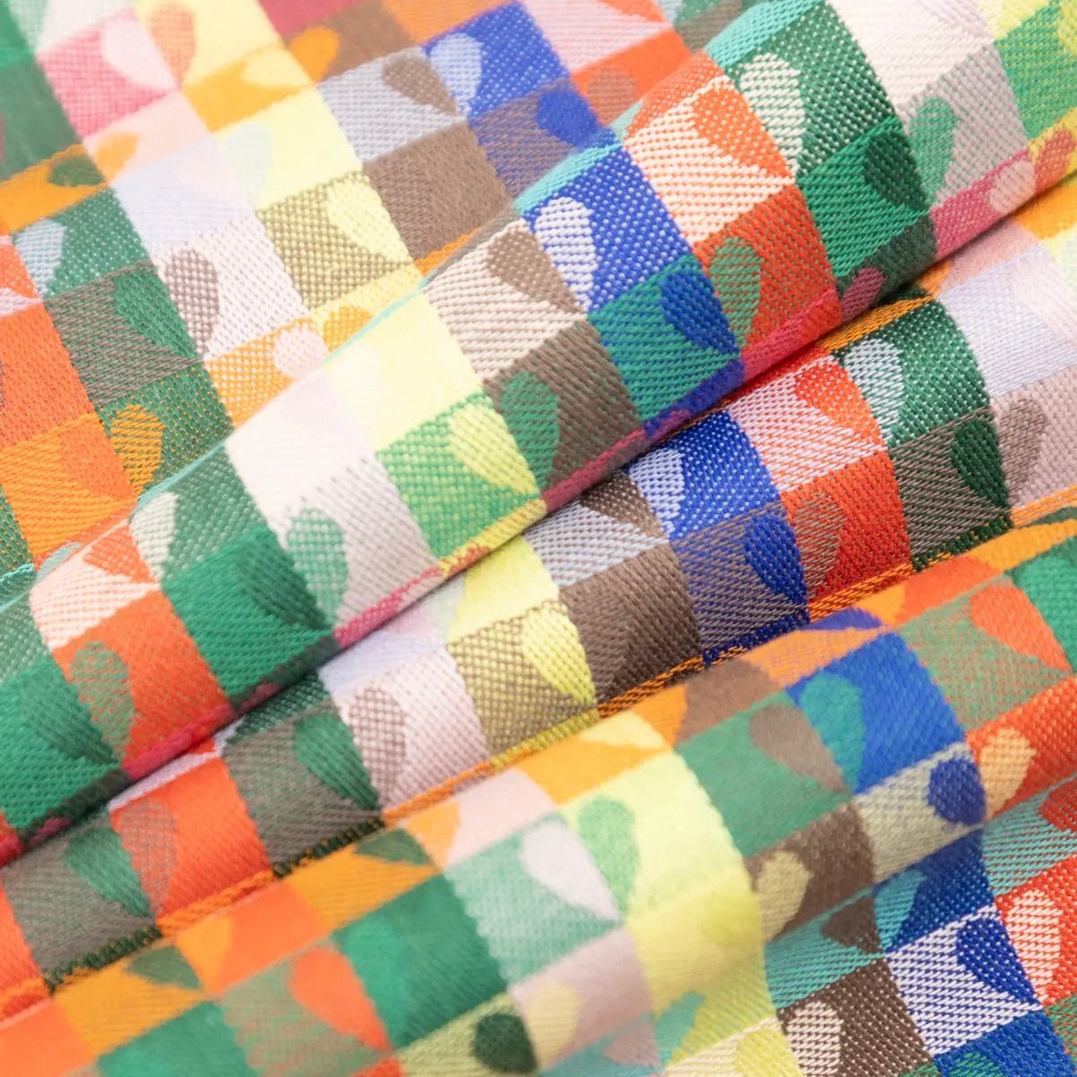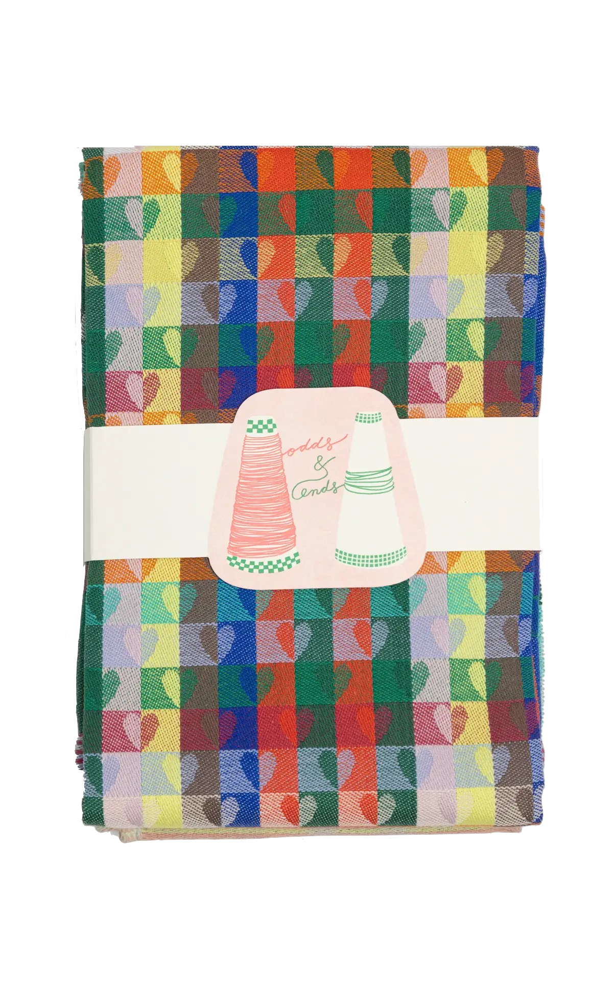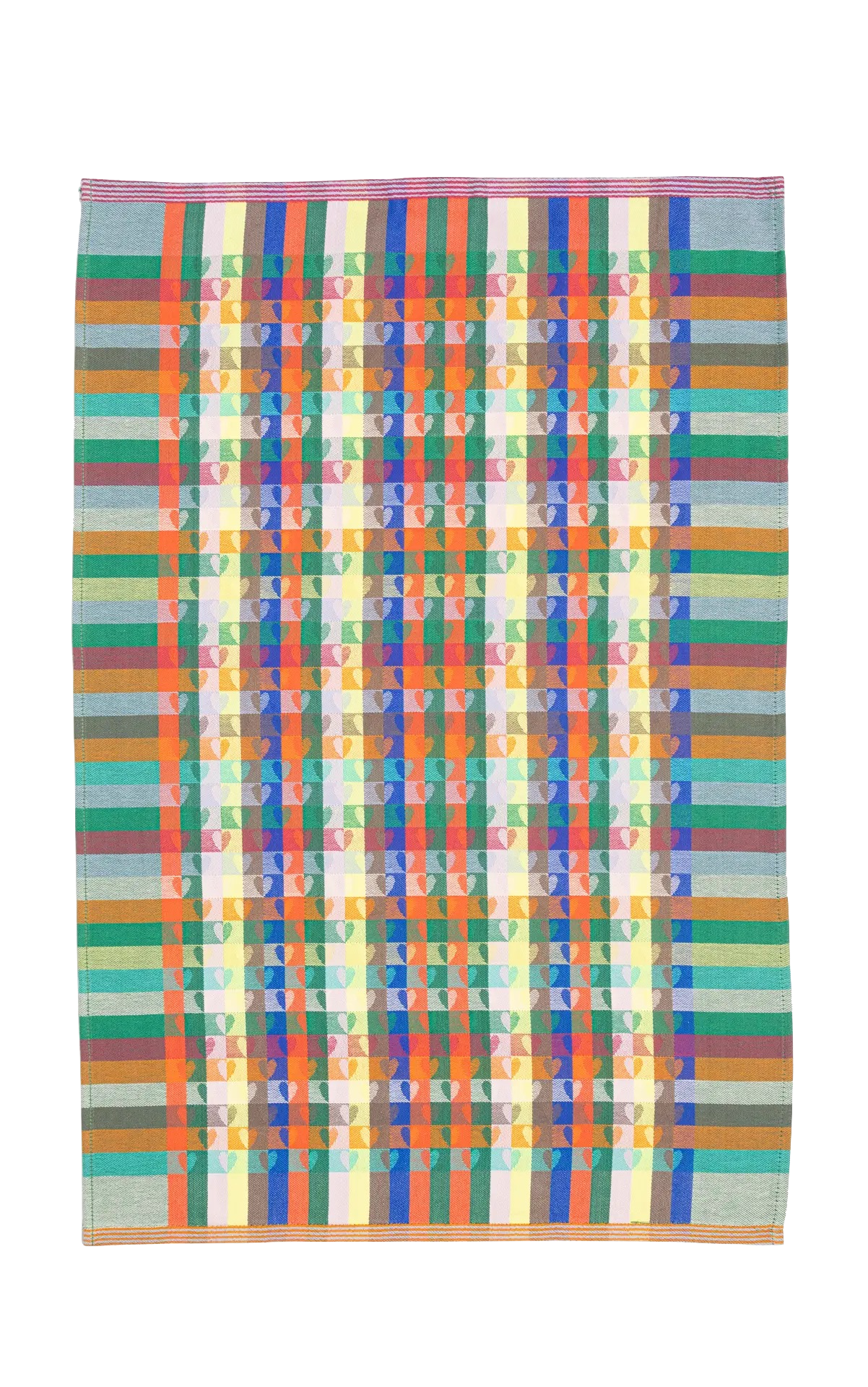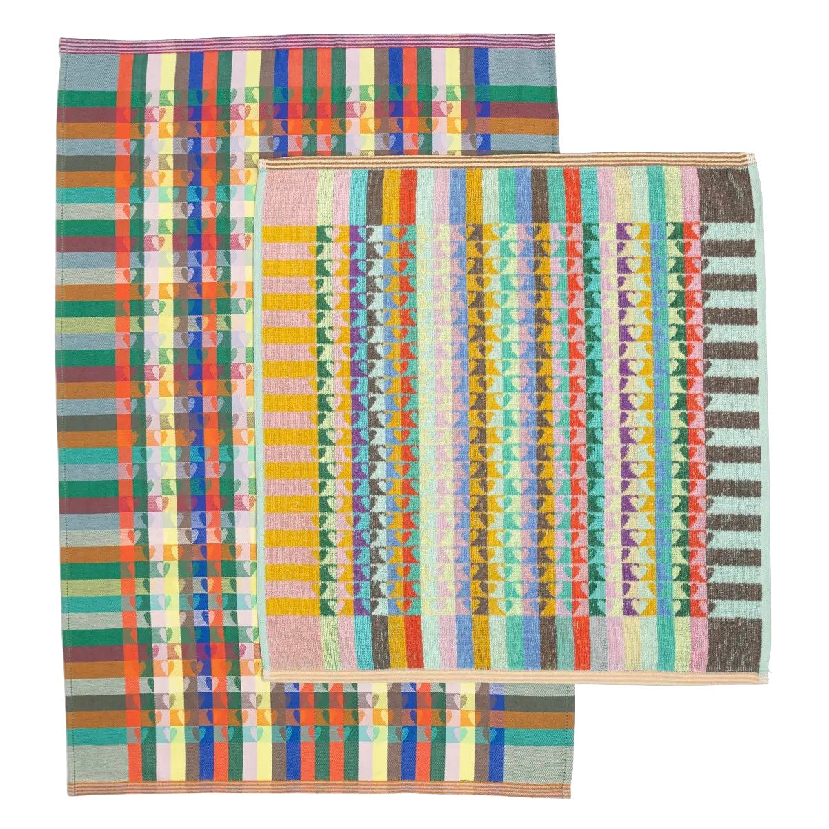 Deze set bestaat uit een handdoek en theedoek met een kleurrijk hartjespatroon. Het ontwerp heet Wederhelft. Hierin zie je een gingham-ruit in meerdere kleuren, aangevuld met kleine hartjes. Het dessin is vergelijkbaar voor de theedoek en keukendoek.
