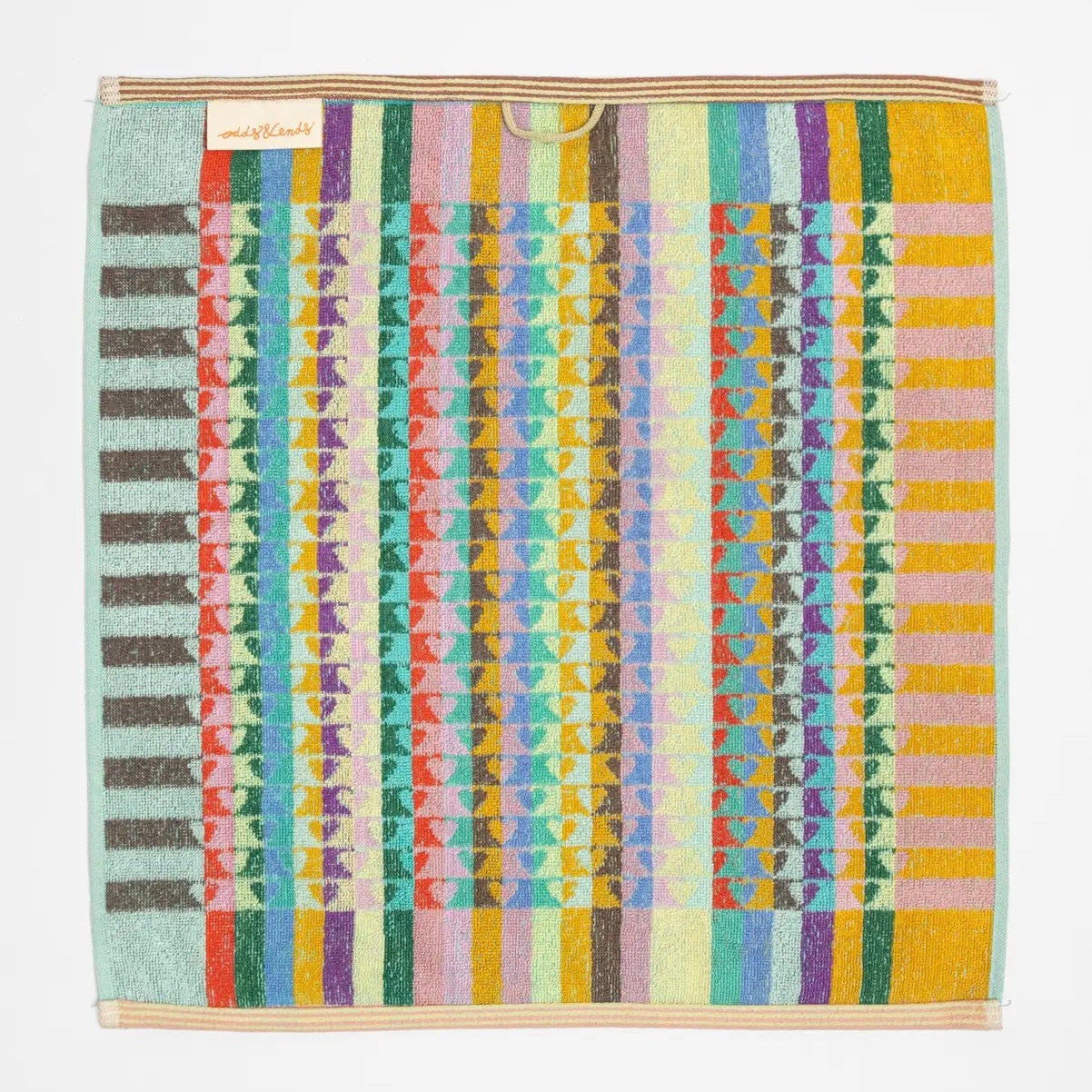 Omdat de handdoeken geweven worden met kleine partijen restmateriaal, kunnen de producten variëren in kleur. Wel blijft het algemene palet altijd behouden. De handdoek die je ontvangt, kan daardoor iets afwijken van de foto.