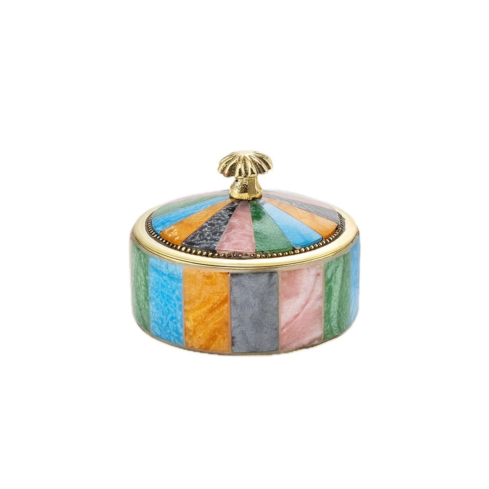 Met een compact formaat van 6 x 7 x 7 cm is dit doosje perfect om je ringen, oorbellen, armbandjes of andere kleine schatten netjes te bewaren. De ronde vorm, het speelse circuspatroon in zachte kleuren en de messing details maken dit opbergdoosje een echte blikvanger op je kaptafel, nachtkastje of bureau.