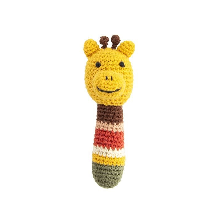 Deze kleurrijke, handgemaakte rammelaar is perfect als kraamcadeautje. We hebben diverse jungledieren in ons assortiment.