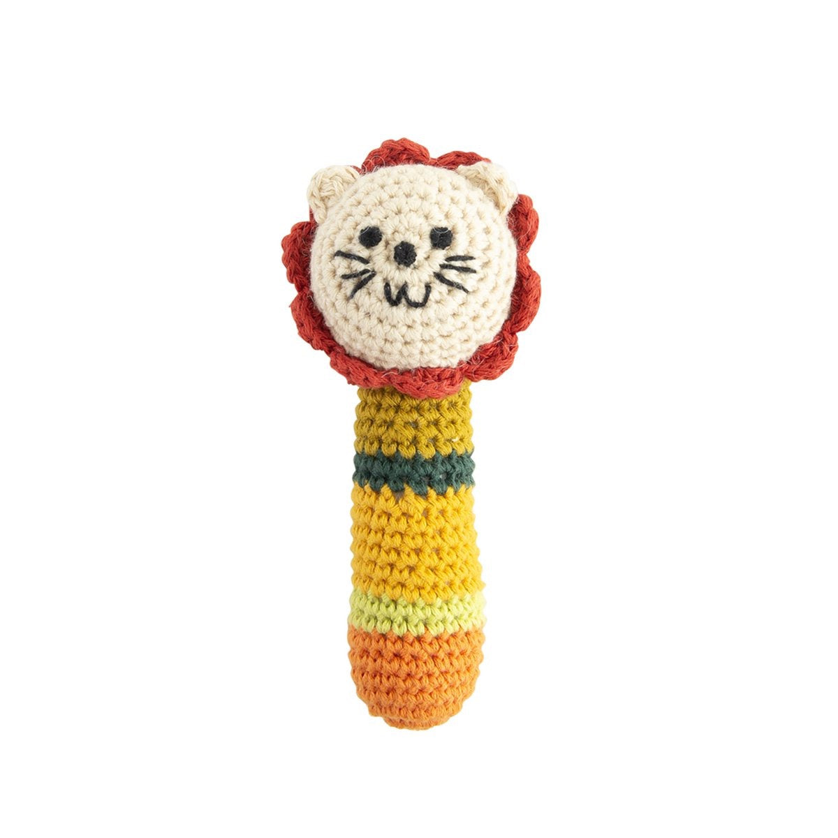 Deze kleurrijke, handgemaakte rammelaar is perfect als kraamcadeautje. We hebben diverse jungledieren in ons assortiment.